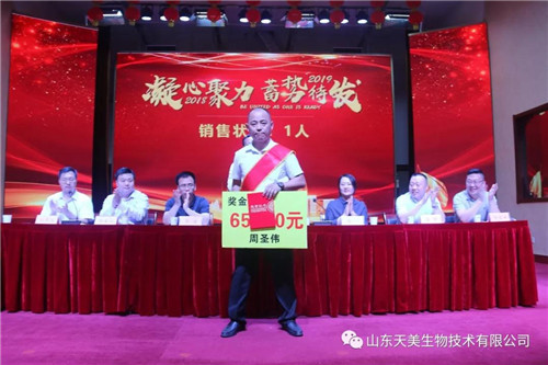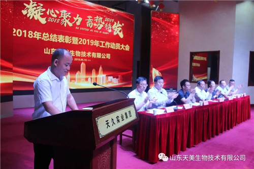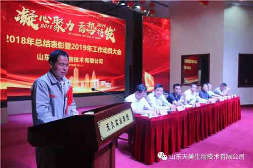 2019年5月15日上午,山東天美生物技術有限公司在集團公司大禮堂召開2018年度工作總結表彰暨2019年工作動員大會。本次表彰大會主要是總結2018年的經驗、教訓,肯定成績,并安排2019年的目標任務。